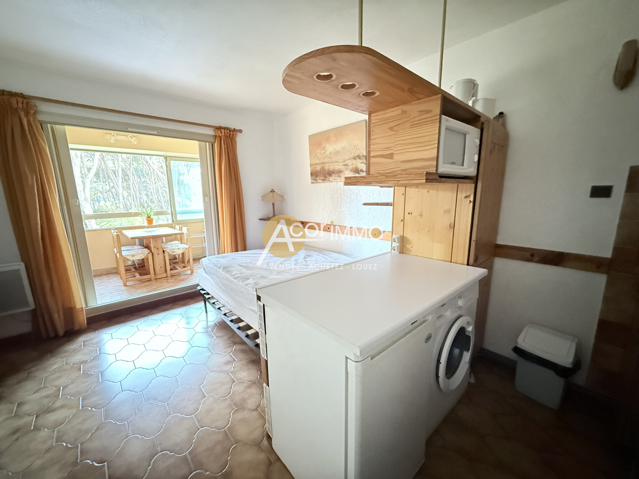 La Coudoulière à Six Fours : studio meublé de 22 m2 + 6m2 de loggia au 1er étage avec ascenseur. Composé d'une pièce à vivre avec coin cuisine entièrement équipée, salle de bains et wc séparé. GARAGE inclus dans le prix.