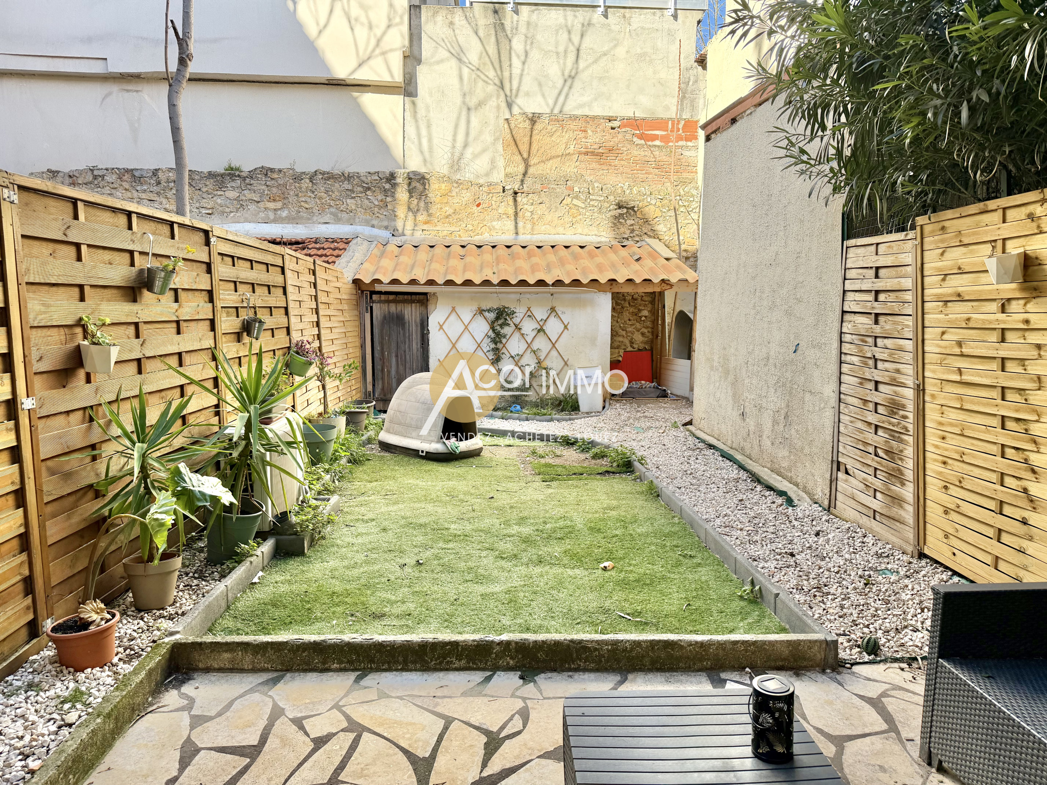 Entièrement rénové, il dispose d'une pièce de vie donnant directement sur une parcelle de terrain privative de 50m2 avec un cabanon cadastré.